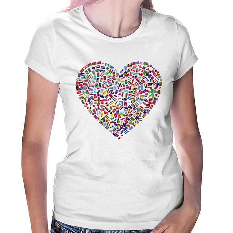A Baby Look Coração Bandeiras é confeccionada em tecido 100% Poliéster com gola redonda viés, costura simples e modelagem com caimento acinturado. A estampa do tema "Bandeiras" é feita através do processo Sublimação. Produto ideal para quem busca fidelidade da estampa e ótimo custo-benefício, a estampa não desbota nem quebra.