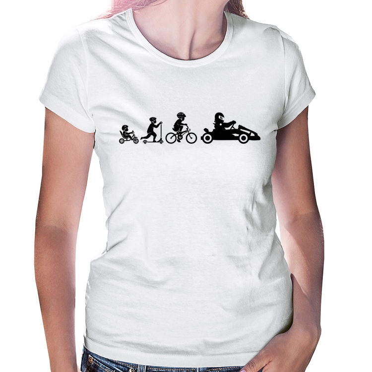 A Baby Look Evolução do Kart é confeccionada em tecido 100% Poliéster com gola redonda viés, costura simples e modelagem com caimento acinturado. A estampa do tema "Esportes" é feita através do processo Sublimação. Produto ideal para quem busca fidelidade da estampa e ótimo custo-benefício, a estampa não desbota nem quebra.