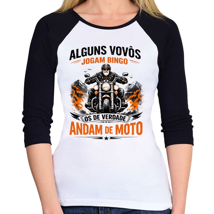 A Baby Look Raglan Alguns vovôs jogam bingo, os de verdade andam de moto Manga 3/4 é confeccionada em tecido 100% Poliéster com gola redonda viés na cor preta, costura simples e modelagem com caimento acinturado. A estampa do tema "Motos e Bikes" é feita através do processo Sublimação. Produto ideal para quem busca fidelidade da estampa e ótimo custo-benefício, a estampa não desbota nem quebra.