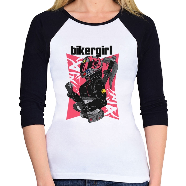 A Baby Look Raglan Biker Girl Manga 3/4 é confeccionada em tecido 100% Poliéster com gola redonda viés na cor preta, costura simples e modelagem com caimento acinturado. A estampa do tema "Motos e Bikes" é feita através do processo Sublimação. Produto ideal para quem busca fidelidade da estampa e ótimo custo-benefício, a estampa não desbota nem quebra.