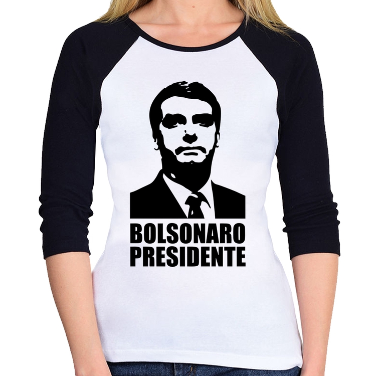 A Baby Look Raglan Bolsonaro Presidente Manga 3/4 é confeccionada em tecido 100% Poliéster com gola redonda viés na cor preta, costura simples e modelagem com caimento acinturado. A estampa do tema "Política" é feita através do processo Sublimação. Produto ideal para quem busca fidelidade da estampa e ótimo custo-benefício, a estampa não desbota nem quebra.