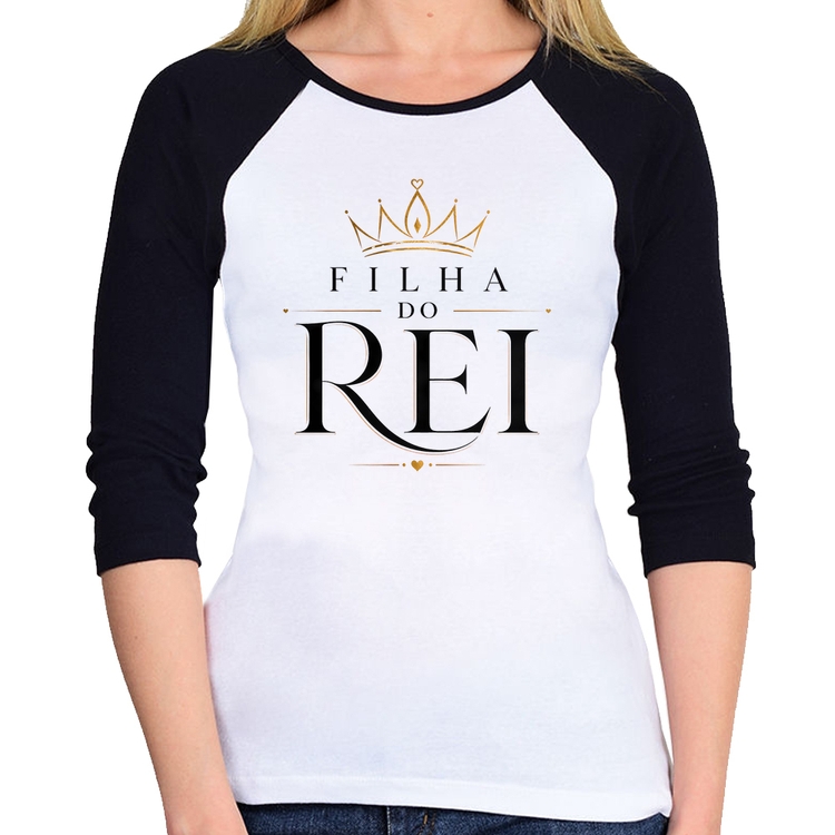 A Baby Look Raglan Filha do Rei Manga 3/4 é confeccionada em tecido 100% Poliéster com gola redonda viés na cor preta, costura simples e modelagem com caimento acinturado. A estampa do tema "Religiosas" é feita através do processo Sublimação. Produto ideal para quem busca fidelidade da estampa e ótimo custo-benefício, a estampa não desbota nem quebra.