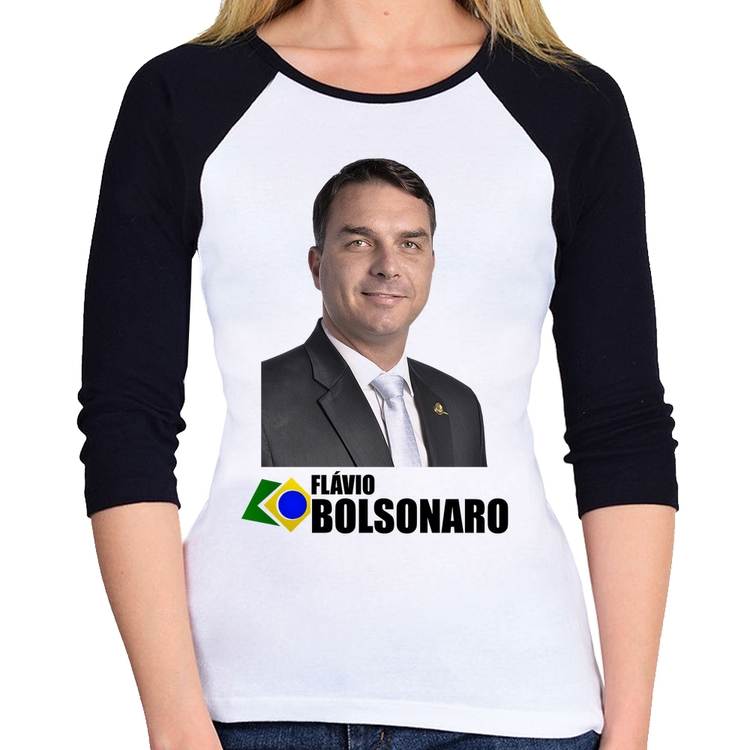 A Baby Look Raglan Flávio Bolsonaro Manga 3/4 é confeccionada em tecido 100% Poliéster com gola redonda viés na cor preta, costura simples e modelagem com caimento acinturado. A estampa do tema "Política" é feita através do processo Sublimação. Produto ideal para quem busca fidelidade da estampa e ótimo custo-benefício, a estampa não desbota nem quebra.