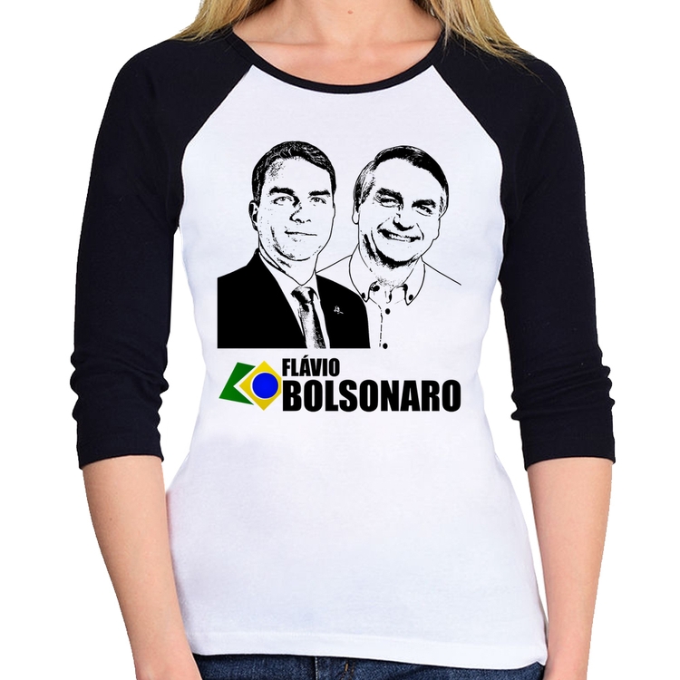 A Baby Look Raglan Flávio e Jair Bolsonaro 2026 Manga 3/4 é confeccionada em tecido 100% Poliéster com gola redonda viés na cor preta, costura simples e modelagem com caimento acinturado. A estampa do tema "Política" é feita através do processo Sublimação. Produto ideal para quem busca fidelidade da estampa e ótimo custo-benefício, a estampa não desbota nem quebra.