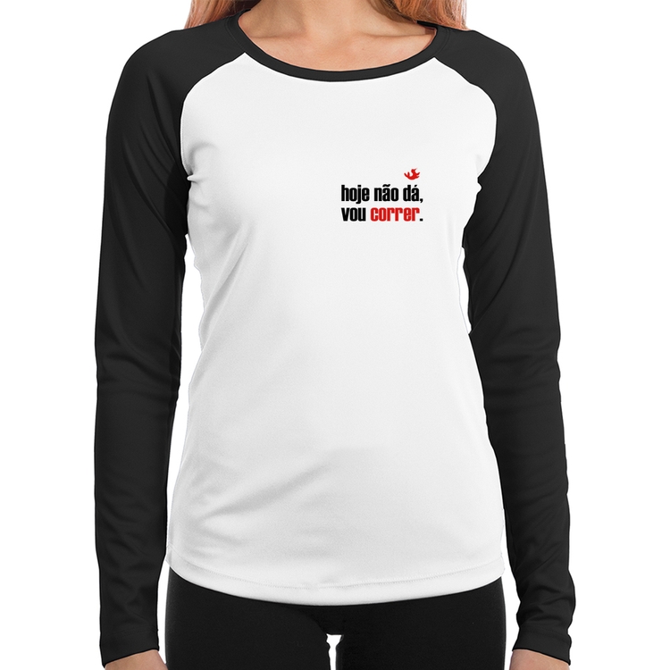 A Baby Look Raglan Hoje não dá, vou correr Manga Longa é confeccionada em tecido 100% Poliéster com gola redonda viés na cor preta, costura simples e modelagem com caimento acinturado. A estampa do tema "Esportes" é feita através do processo Sublimação. Produto ideal para quem busca fidelidade da estampa e ótimo custo-benefício, a estampa não desbota nem quebra.