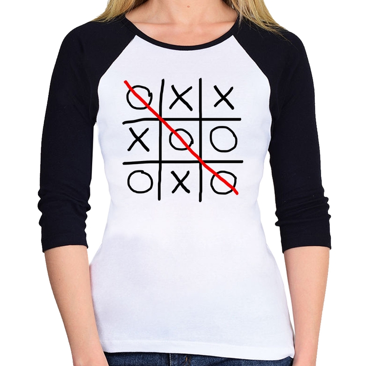 A Baby Look Raglan Jogo da Velha Manga 3/4 é confeccionada em tecido 100% Poliéster com gola redonda viés na cor preta, costura simples e modelagem com caimento acinturado. A estampa do tema "Game e Jogos" é feita através do processo Sublimação. Produto ideal para quem busca fidelidade da estampa e ótimo custo-benefício, a estampa não desbota nem quebra.