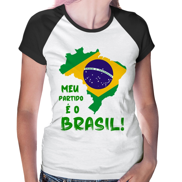 A Baby Look Raglan Meu partido é o Brasil é confeccionada em tecido 100% Poliéster com gola redonda viés na cor preta, costura simples e modelagem com caimento acinturado. A estampa do tema "Política" é feita através do processo Sublimação. Produto ideal para quem busca fidelidade da estampa e ótimo custo-benefício, a estampa não desbota nem quebra.