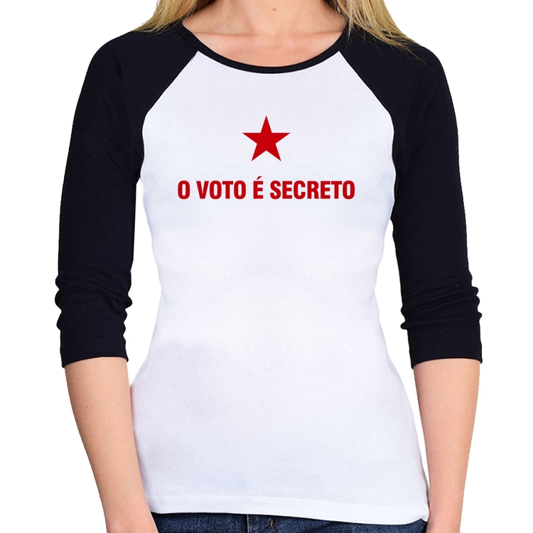A Baby Look Raglan O voto é secreto Manga 3/4 é confeccionada em tecido 100% Poliéster com gola redonda viés na cor preta, costura simples e modelagem com caimento acinturado. A estampa do tema "Política" é feita através do processo Sublimação. Produto ideal para quem busca fidelidade da estampa e ótimo custo-benefício, a estampa não desbota nem quebra.