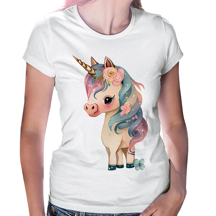 A Baby Look Unicórnio e Flores é confeccionada em tecido 100% Poliéster com gola redonda viés, costura simples e modelagem com caimento acinturado. A estampa do tema "Animais" é feita através do processo Sublimação. Produto ideal para quem busca fidelidade da estampa e ótimo custo-benefício, a estampa não desbota nem quebra.