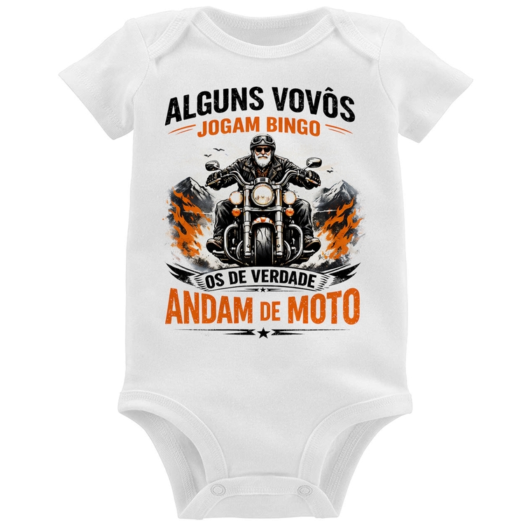 O Body Bebê Alguns vovôs jogam bingo, os de verdade andam de moto é confeccionado em tecido 100% Poliéster com gola redonda, costura simples e modelagem com caimento reto. A estampa do tema "Motos e Bikes" é feita através do processo Sublimação. Produto ideal para quem busca fidelidade da estampa e ótimo custo-benefício, a estampa não desbota nem quebra.