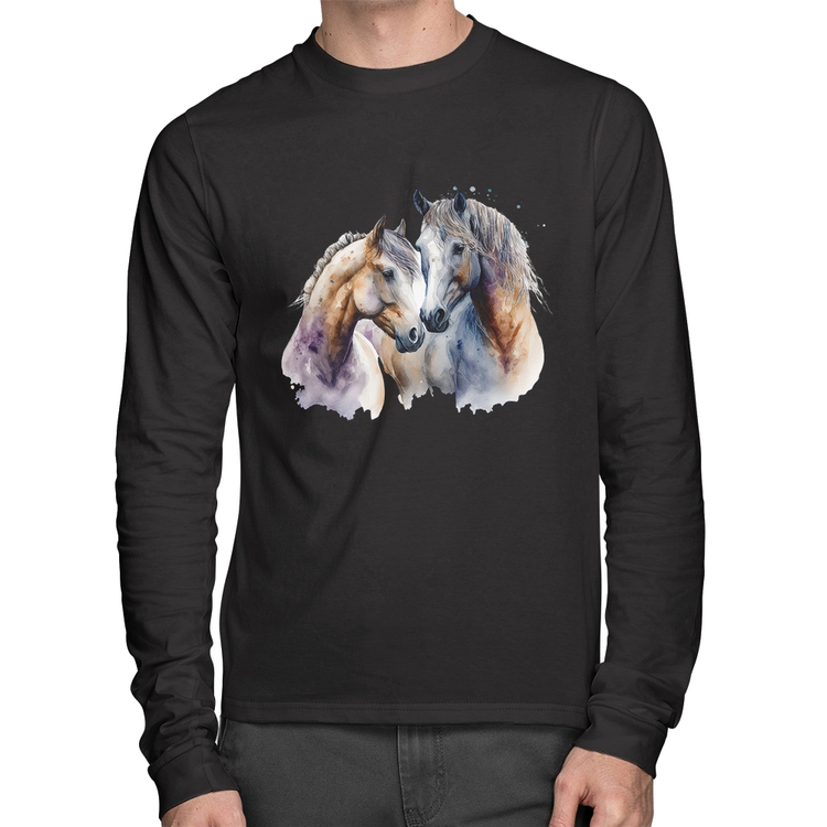 A Camiseta Algodão Cavalo e Égua Manga Longa é confeccionada em tecido 100% Algodão, malha penteada fio 30.1 com gola redonda, costura reforçada ombro a ombro e modelagem com caimento reto. A estampa do tema "Animais" é feita através do processo Digital DTG. Produto ideal para quem busca ótima qualidade e conforto. O percentual de encolhimento pós lavagem é 3,50%.