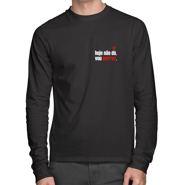 A Camiseta Algodão Hoje não dá, vou correr Manga Longa é confeccionada em tecido 100% Algodão, malha penteada fio 30.1 com gola redonda, costura reforçada ombro a ombro e modelagem com caimento reto. A estampa do tema "Esportes" é feita através do processo Digital DTG. Produto ideal para quem busca ótima qualidade e conforto. O percentual de encolhimento pós lavagem é 3,50%.