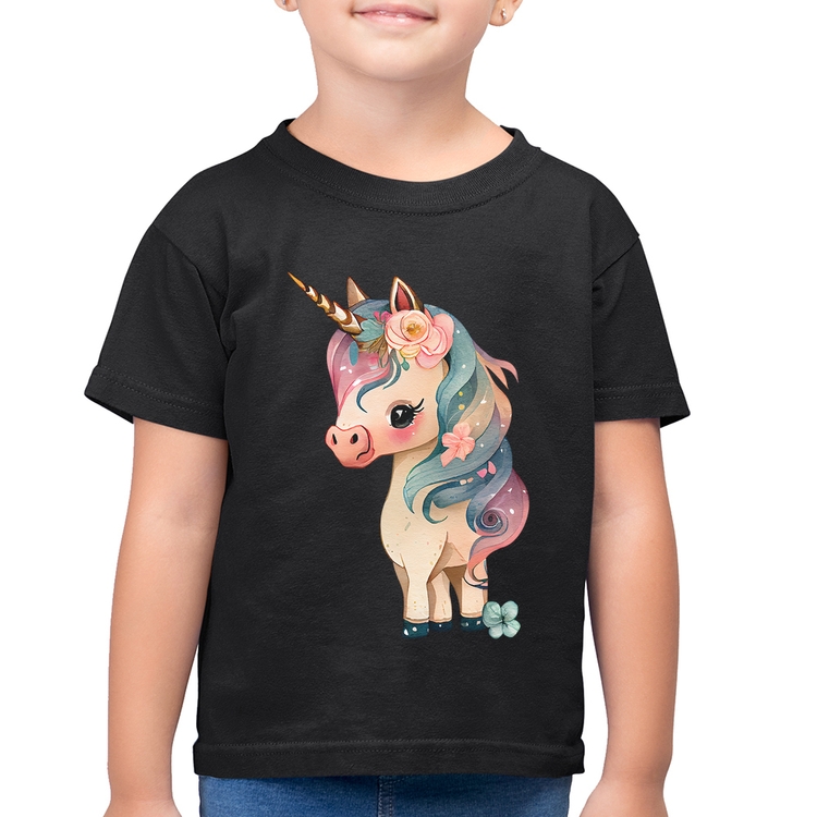 A Camiseta Algodão Infantil Unicórnio e Flores é confeccionada em tecido 100% Algodão, malha penteada fio 30.1 com gola redonda, costura reforçada ombro a ombro e modelagem com caimento reto. A estampa do tema "Animais" é feita através do processo Digital DTG. Produto ideal para quem busca ótima qualidade e conforto. O percentual de encolhimento pós lavagem é 3,50%.