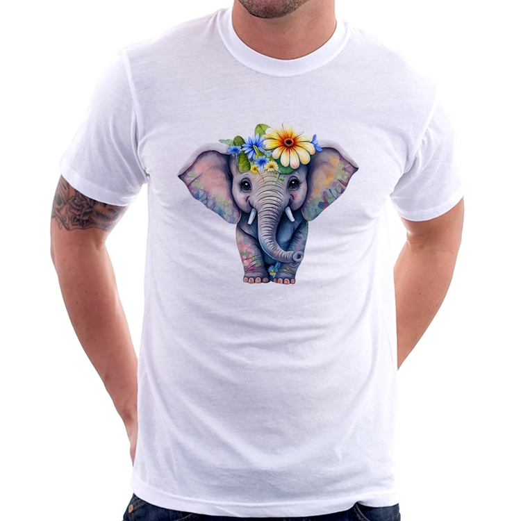 A Camiseta Elefante E Flores é confeccionada em tecido 100% Poliéster com gola redonda, costura simples e modelagem com caimento reto. A estampa do tema "Animais" é feita através do processo Sublimação. Produto ideal para quem busca fidelidade da estampa e ótimo custo-benefício, a estampa não desbota nem quebra.