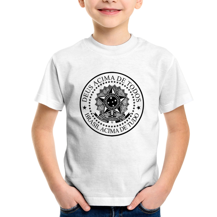 A Camiseta Infantil Brasil Acima de Tudo Deus Acima de Todos é confeccionada em tecido 100% Poliéster com gola redonda, costura simples e modelagem com caimento reto. A estampa do tema "Política" é feita através do processo Sublimação. Produto ideal para quem busca fidelidade da estampa e ótimo custo-benefício, a estampa não desbota nem quebra.