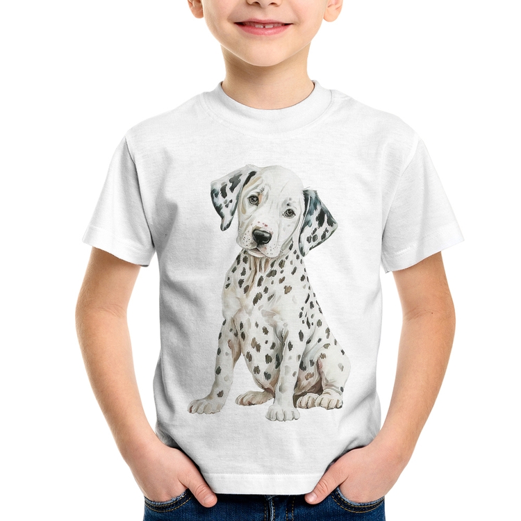 A Camiseta Infantil Cachorro Dálmata é confeccionada em tecido 100% Poliéster com gola redonda, costura simples e modelagem com caimento reto. A estampa do tema "Animais" é feita através do processo Sublimação. Produto ideal para quem busca fidelidade da estampa e ótimo custo-benefício, a estampa não desbota nem quebra.