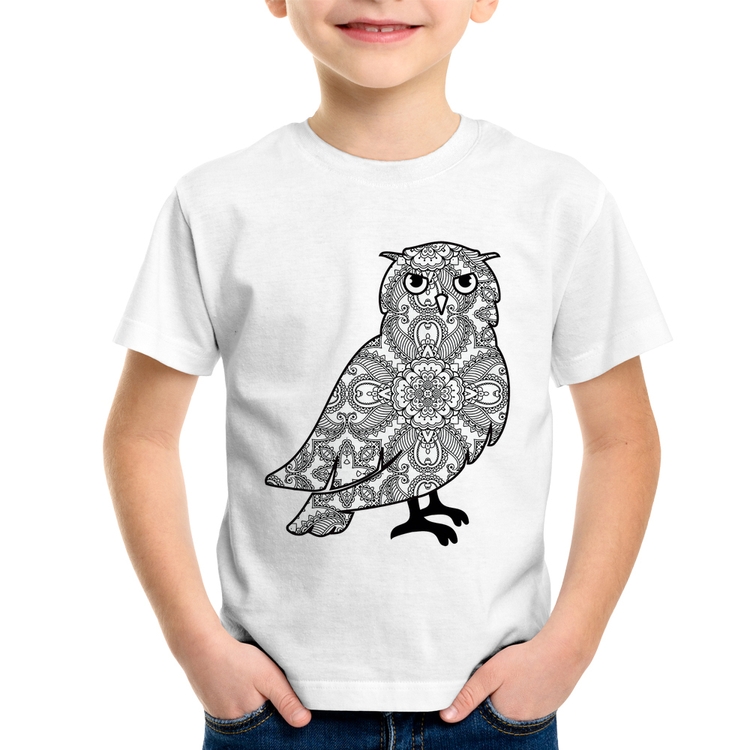 A Camiseta Infantil Coruja Mandala é confeccionada em tecido 100% Poliéster com gola redonda, costura simples e modelagem com caimento reto. A estampa do tema "Animais" é feita através do processo Sublimação. Produto ideal para quem busca fidelidade da estampa e ótimo custo-benefício, a estampa não desbota nem quebra.