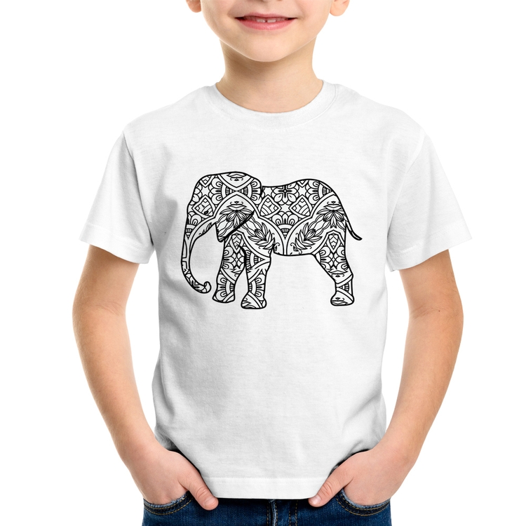 A Camiseta Infantil Elefante Mandala é confeccionada em tecido 100% Poliéster com gola redonda, costura simples e modelagem com caimento reto. A estampa do tema "Animais" é feita através do processo Sublimação. Produto ideal para quem busca fidelidade da estampa e ótimo custo-benefício, a estampa não desbota nem quebra.