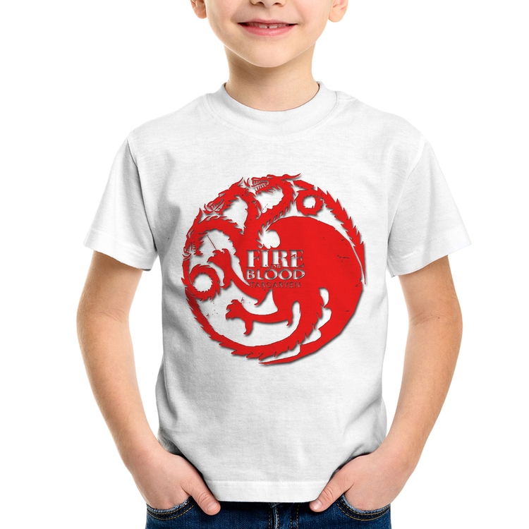 A Camiseta Infantil Fire and Blood Targaryen é confeccionada em tecido 100% Poliéster com gola redonda, costura simples e modelagem com caimento reto. A estampa do tema "Séries" é feita através do processo Sublimação. Produto ideal para quem busca fidelidade da estampa e ótimo custo-benefício, a estampa não desbota nem quebra.