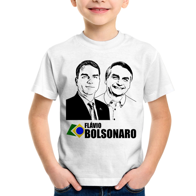 A Camiseta Infantil Flávio e Jair Bolsonaro 2026 é confeccionada em tecido 100% Poliéster com gola redonda, costura simples e modelagem com caimento reto. A estampa do tema "Política" é feita através do processo Sublimação. Produto ideal para quem busca fidelidade da estampa e ótimo custo-benefício, a estampa não desbota nem quebra.