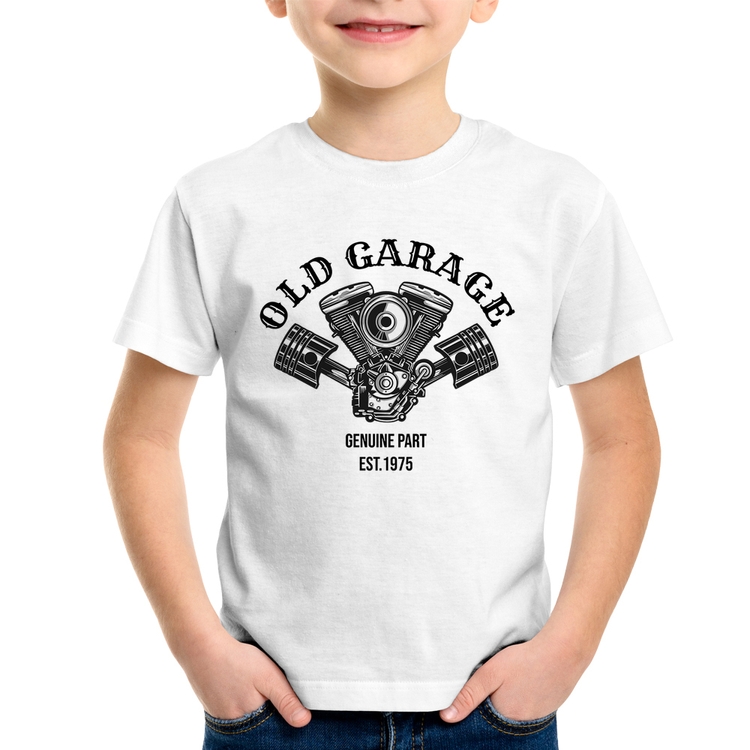 A Camiseta Infantil Old Garage Genuine Part Est.1975 é confeccionada em tecido 100% Poliéster com gola redonda, costura simples e modelagem com caimento reto. A estampa do tema "Carros" é feita através do processo Sublimação. Produto ideal para quem busca fidelidade da estampa e ótimo custo-benefício, a estampa não desbota nem quebra.
