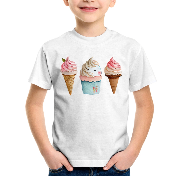 A Camiseta Infantil Unicórnio Sorvete é confeccionada em tecido 100% Poliéster com gola redonda, costura simples e modelagem com caimento reto. A estampa do tema "Animais" é feita através do processo Sublimação. Produto ideal para quem busca fidelidade da estampa e ótimo custo-benefício, a estampa não desbota nem quebra.