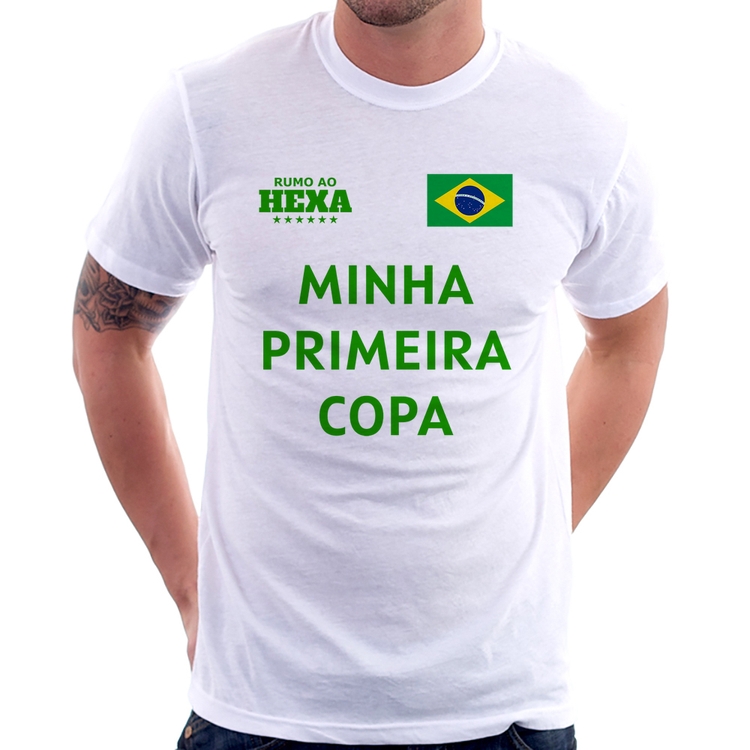 A Camiseta Minha Primeira Copa do Mundo é confeccionada em tecido 100% Poliéster com gola redonda, costura simples e modelagem com caimento reto. A estampa do tema "Esportes" é feita através do processo Sublimação. Produto ideal para quem busca fidelidade da estampa e ótimo custo-benefício, a estampa não desbota nem quebra.