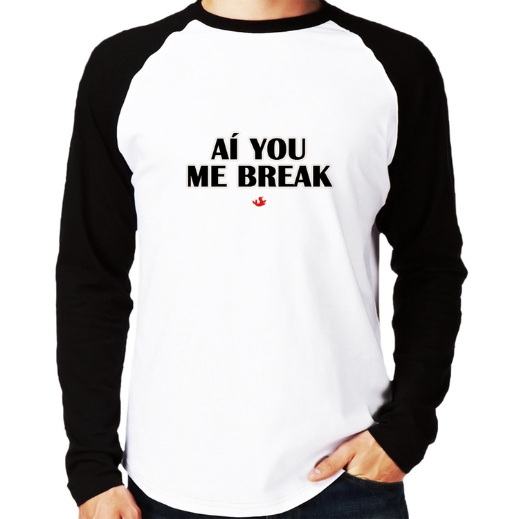 A Camiseta Raglan Aí you me break Manga Longa é confeccionada em tecido 100% Poliéster com gola redonda na cor preta, costura simples e modelagem com caimento reto. A estampa do tema "Frases e Memes" é feita através do processo Sublimação. Produto ideal para quem busca fidelidade da estampa e ótimo custo-benefício, a estampa não desbota nem quebra.