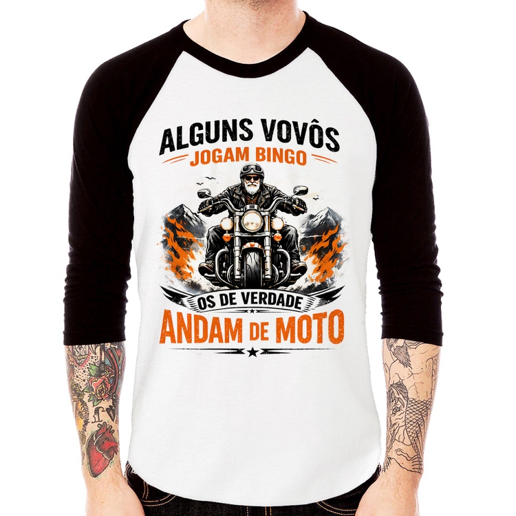 A Camiseta Raglan Alguns vovôs jogam bingo, os de verdade andam de moto Manga 3/4 é confeccionada em tecido 100% Poliéster com gola redonda na cor preta, costura simples e modelagem com caimento reto. A estampa do tema "Motos e Bikes" é feita através do processo Sublimação. Produto ideal para quem busca fidelidade da estampa e ótimo custo-benefício, a estampa não desbota nem quebra.