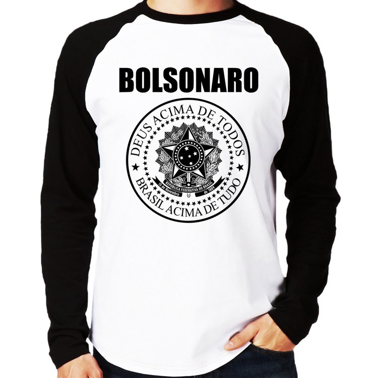 A Camiseta Raglan Bolsonaro Brasil Acima de Tudo Deus Acima de Todos Manga Longa é confeccionada em tecido 100% Poliéster com gola redonda na cor preta, costura simples e modelagem com caimento reto. A estampa do tema "Política" é feita através do processo Sublimação. Produto ideal para quem busca fidelidade da estampa e ótimo custo-benefício, a estampa não desbota nem quebra.