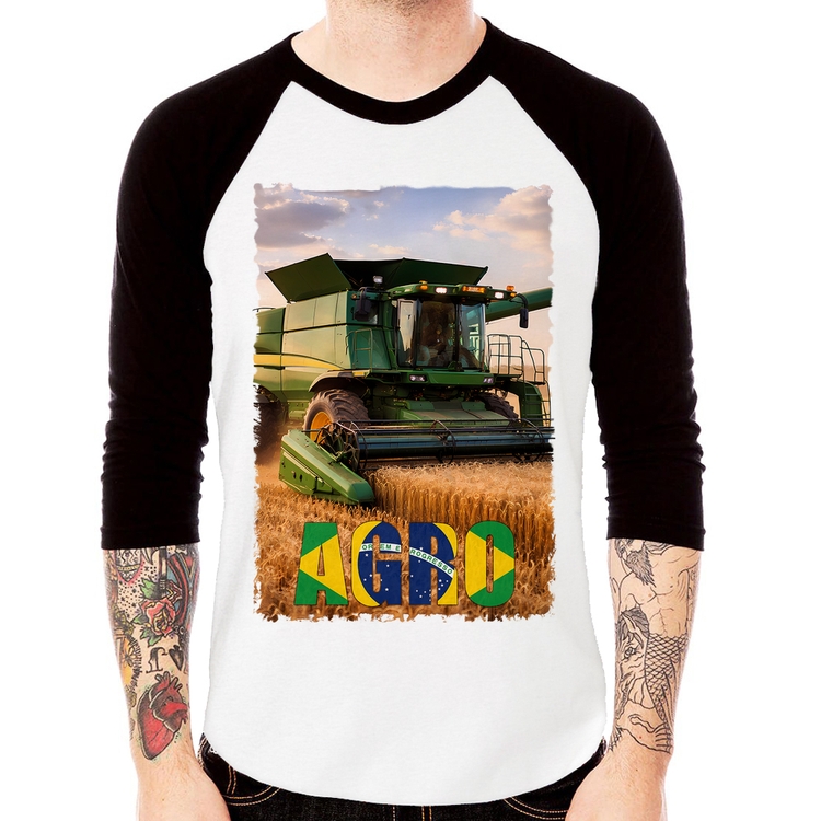 A Camiseta Raglan Colheitadeira Agro Brasil Rural Manga 3/4 é confeccionada em tecido 100% Poliéster com gola redonda na cor preta, costura simples e modelagem com caimento reto. A estampa do tema "Agro" é feita através do processo Sublimação. Produto ideal para quem busca fidelidade da estampa e ótimo custo-benefício, a estampa não desbota nem quebra.