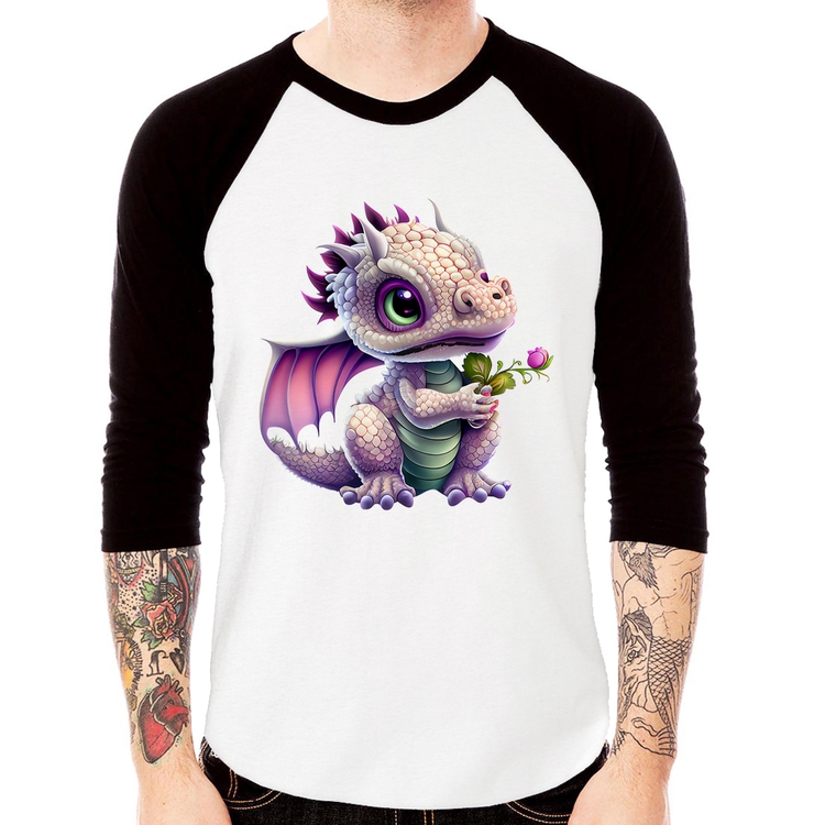 A Camiseta Raglan Dragão Bebê Manga 3/4 é confeccionada em tecido 100% Poliéster com gola redonda na cor preta, costura simples e modelagem com caimento reto. A estampa do tema "Animais" é feita através do processo Sublimação. Produto ideal para quem busca fidelidade da estampa e ótimo custo-benefício, a estampa não desbota nem quebra.