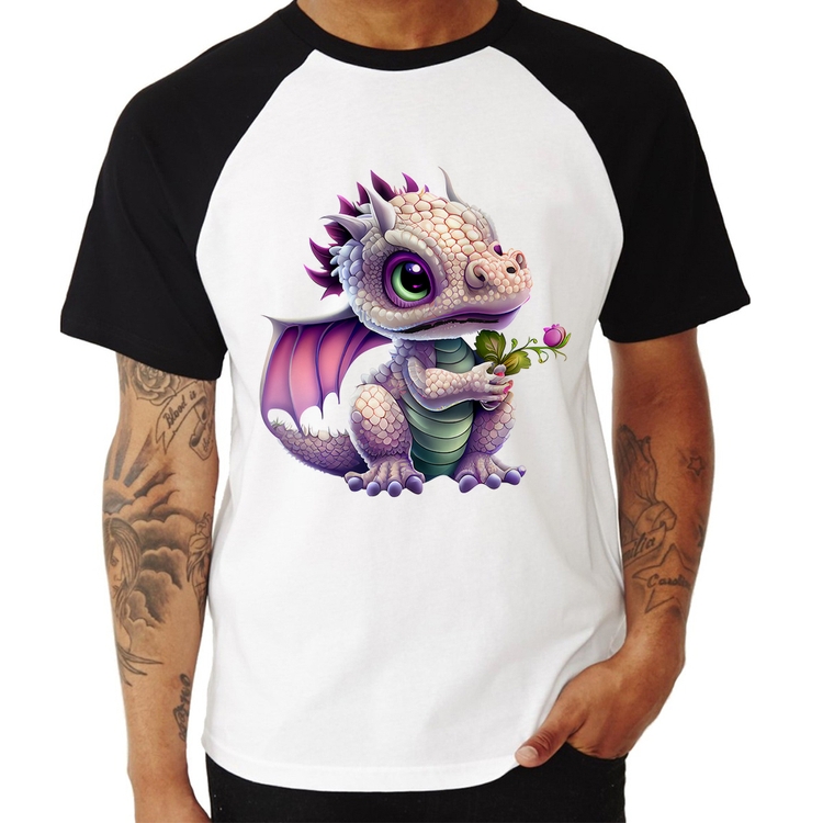 A Camiseta Raglan Dragão Bebê é confeccionada em tecido 100% Poliéster com gola redonda na cor preta, costura simples e modelagem com caimento reto. A estampa do tema "Animais" é feita através do processo Sublimação. Produto ideal para quem busca fidelidade da estampa e ótimo custo-benefício, a estampa não desbota nem quebra.