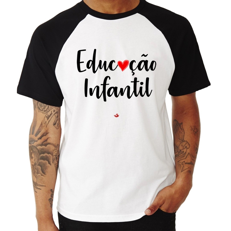 A Camiseta Raglan Educação Infantil por amor é confeccionada em tecido 100% Poliéster com gola redonda na cor preta, costura simples e modelagem com caimento reto. A estampa do tema "Cursos e Profissões" é feita através do processo Sublimação. Produto ideal para quem busca fidelidade da estampa e ótimo custo-benefício, a estampa não desbota nem quebra.