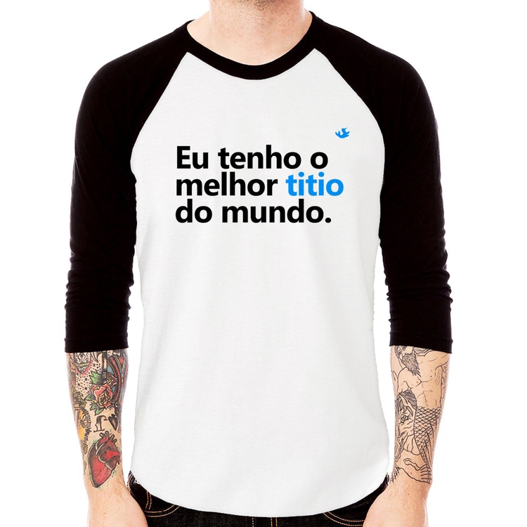 A Camiseta Raglan Eu tenho o melhor titio do mundo Manga 3/4 é confeccionada em tecido 100% Poliéster com gola redonda na cor preta, costura simples e modelagem com caimento reto. A estampa do tema "Comemorativas" é feita através do processo Sublimação. Produto ideal para quem busca fidelidade da estampa e ótimo custo-benefício, a estampa não desbota nem quebra.