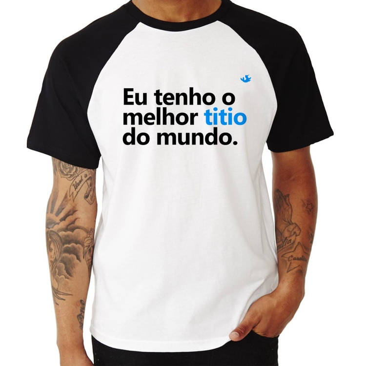 A Camiseta Raglan Eu tenho o melhor titio do mundo é confeccionada em tecido 100% Poliéster com gola redonda na cor preta, costura simples e modelagem com caimento reto. A estampa do tema "Comemorativas" é feita através do processo Sublimação. Produto ideal para quem busca fidelidade da estampa e ótimo custo-benefício, a estampa não desbota nem quebra.