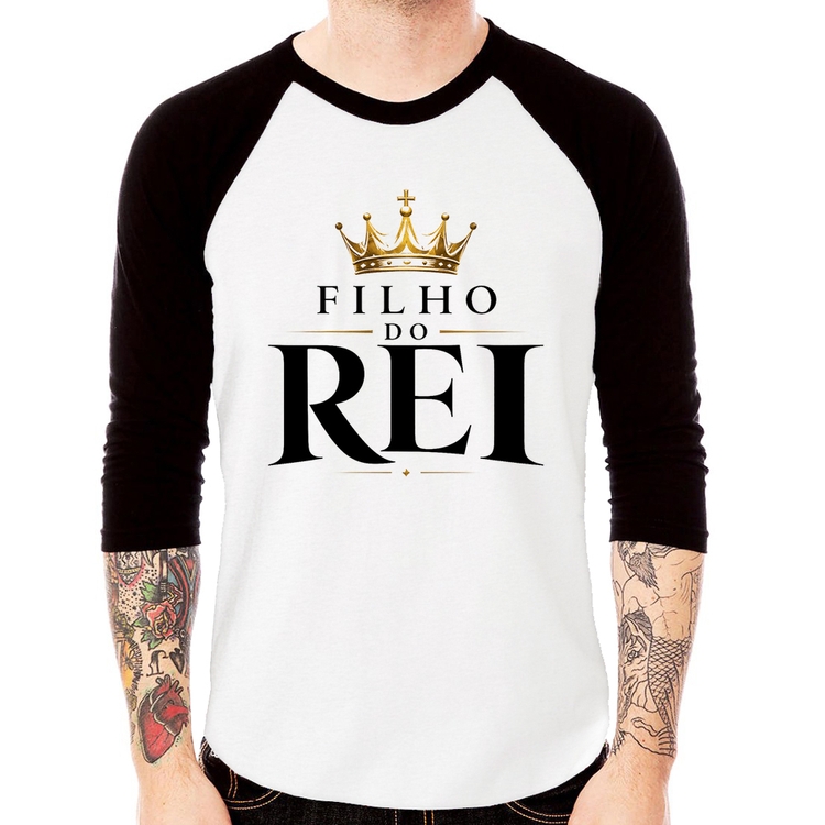 A Camiseta Raglan Filho do Rei Manga 3/4 é confeccionada em tecido 100% Poliéster com gola redonda na cor preta, costura simples e modelagem com caimento reto. A estampa do tema "Religiosas" é feita através do processo Sublimação. Produto ideal para quem busca fidelidade da estampa e ótimo custo-benefício, a estampa não desbota nem quebra.