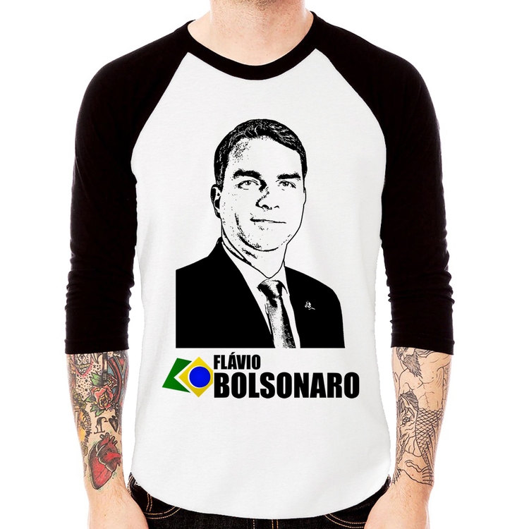 A Camiseta Raglan Flávio Bolsonaro 2026 Manga 3/4 é confeccionada em tecido 100% Poliéster com gola redonda na cor preta, costura simples e modelagem com caimento reto. A estampa do tema "Política" é feita através do processo Sublimação. Produto ideal para quem busca fidelidade da estampa e ótimo custo-benefício, a estampa não desbota nem quebra.