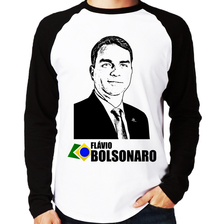 A Camiseta Raglan Flávio Bolsonaro 2026 Manga Longa é confeccionada em tecido 100% Poliéster com gola redonda na cor preta, costura simples e modelagem com caimento reto. A estampa do tema "Política" é feita através do processo Sublimação. Produto ideal para quem busca fidelidade da estampa e ótimo custo-benefício, a estampa não desbota nem quebra.