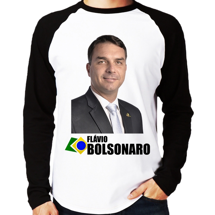 A Camiseta Raglan Flávio Bolsonaro Manga Longa é confeccionada em tecido 100% Poliéster com gola redonda na cor preta, costura simples e modelagem com caimento reto. A estampa do tema "Política" é feita através do processo Sublimação. Produto ideal para quem busca fidelidade da estampa e ótimo custo-benefício, a estampa não desbota nem quebra.