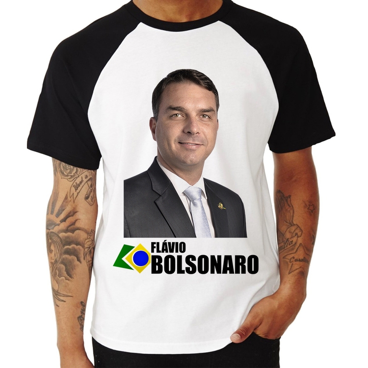 A Camiseta Raglan Flávio Bolsonaro é confeccionada em tecido 100% Poliéster com gola redonda na cor preta, costura simples e modelagem com caimento reto. A estampa do tema "Política" é feita através do processo Sublimação. Produto ideal para quem busca fidelidade da estampa e ótimo custo-benefício, a estampa não desbota nem quebra.