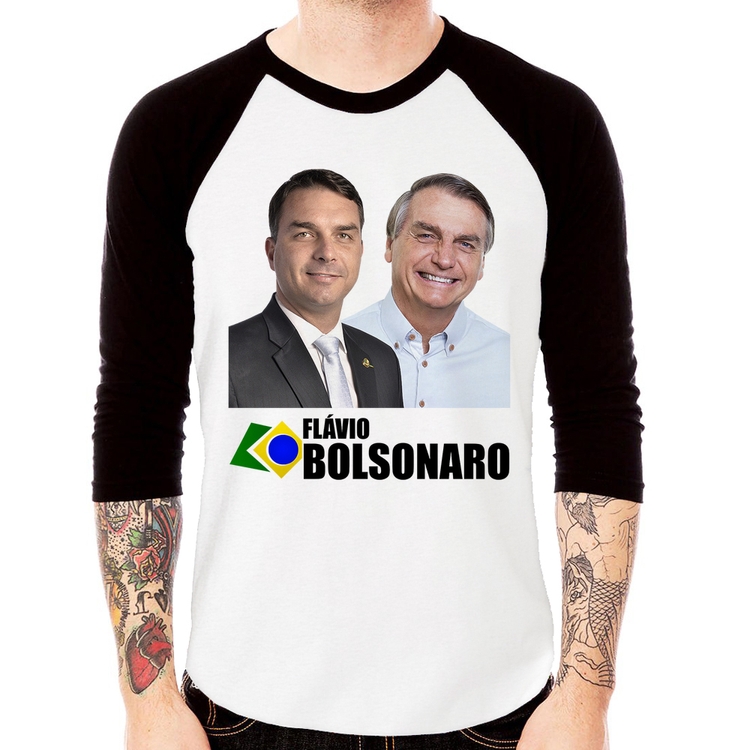 A Camiseta Raglan Flávio e Jair Bolsonaro Manga 3/4 é confeccionada em tecido 100% Poliéster com gola redonda na cor preta, costura simples e modelagem com caimento reto. A estampa do tema "Política" é feita através do processo Sublimação. Produto ideal para quem busca fidelidade da estampa e ótimo custo-benefício, a estampa não desbota nem quebra.