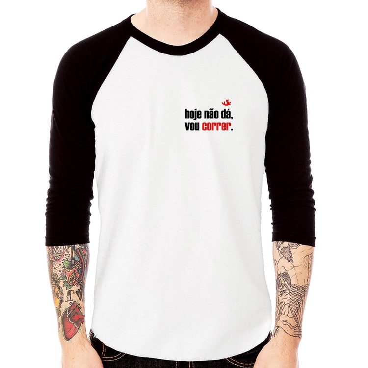 A Camiseta Raglan Hoje não dá, vou correr Manga 3/4 é confeccionada em tecido 100% Poliéster com gola redonda na cor preta, costura simples e modelagem com caimento reto. A estampa do tema "Esportes" é feita através do processo Sublimação. Produto ideal para quem busca fidelidade da estampa e ótimo custo-benefício, a estampa não desbota nem quebra.
