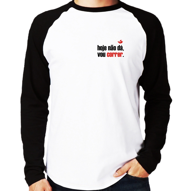 A Camiseta Raglan Hoje não dá, vou correr Manga Longa é confeccionada em tecido 100% Poliéster com gola redonda na cor preta, costura simples e modelagem com caimento reto. A estampa do tema "Esportes" é feita através do processo Sublimação. Produto ideal para quem busca fidelidade da estampa e ótimo custo-benefício, a estampa não desbota nem quebra.