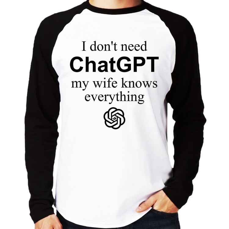 A Camiseta Raglan I don't need ChatGPT my wife knows everything Manga Longa é confeccionada em tecido 100% Poliéster com gola redonda na cor preta, costura simples e modelagem com caimento reto. A estampa do tema "Frases e Memes" é feita através do processo Sublimação. Produto ideal para quem busca fidelidade da estampa e ótimo custo-benefício, a estampa não desbota nem quebra.