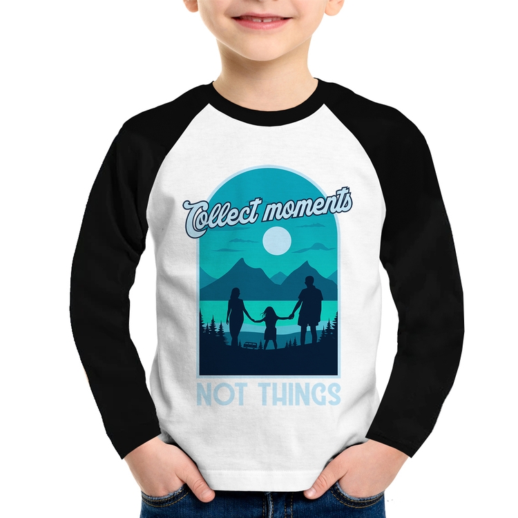 A Camiseta Raglan Infantil Collect Moments Not Things Manga Longa é confeccionada em tecido 100% Poliéster com gola redonda na cor preta, costura simples e modelagem com caimento reto. A estampa do tema "Frases e Memes" é feita através do processo Sublimação. Produto ideal para quem busca fidelidade da estampa e ótimo custo-benefício, a estampa não desbota nem quebra.