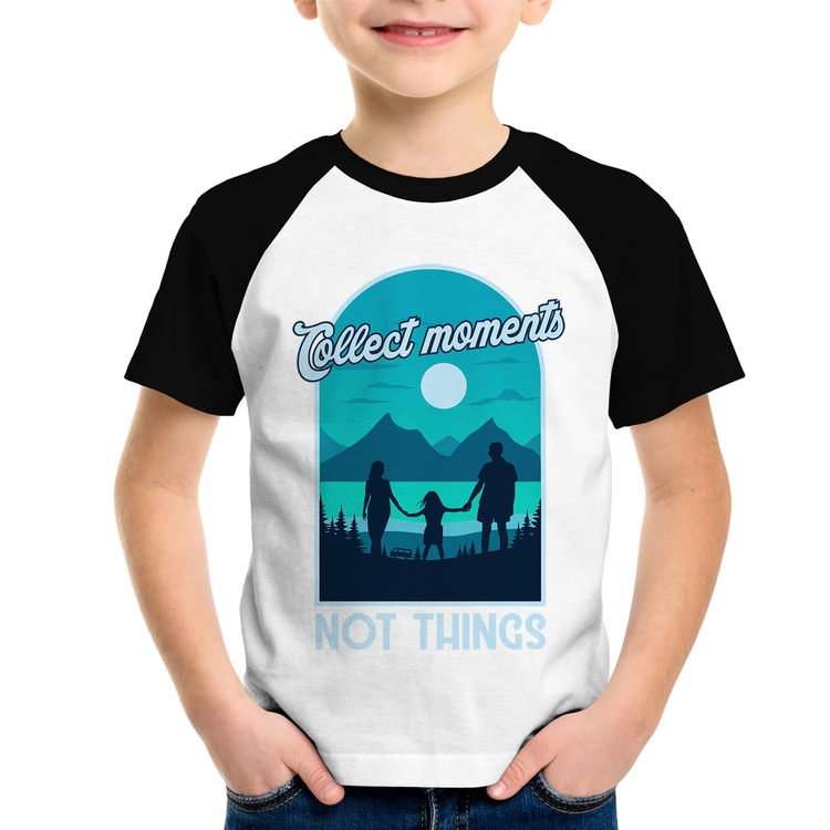 A Camiseta Raglan Infantil Collect Moments Not Things é confeccionada em tecido 100% Poliéster com gola redonda na cor preta, costura simples e modelagem com caimento reto. A estampa do tema "Frases e Memes" é feita através do processo Sublimação. Produto ideal para quem busca fidelidade da estampa e ótimo custo-benefício, a estampa não desbota nem quebra.