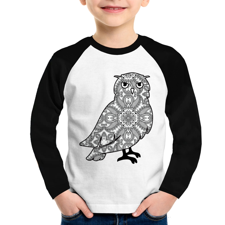 A Camiseta Raglan Infantil Coruja Mandala Manga Longa é confeccionada em tecido 100% Poliéster com gola redonda na cor preta, costura simples e modelagem com caimento reto. A estampa do tema "Animais" é feita através do processo Sublimação. Produto ideal para quem busca fidelidade da estampa e ótimo custo-benefício, a estampa não desbota nem quebra.
