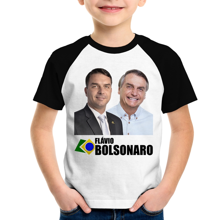 A Camiseta Raglan Infantil Flávio e Jair Bolsonaro é confeccionada em tecido 100% Poliéster com gola redonda na cor preta, costura simples e modelagem com caimento reto. A estampa do tema "Política" é feita através do processo Sublimação. Produto ideal para quem busca fidelidade da estampa e ótimo custo-benefício, a estampa não desbota nem quebra.