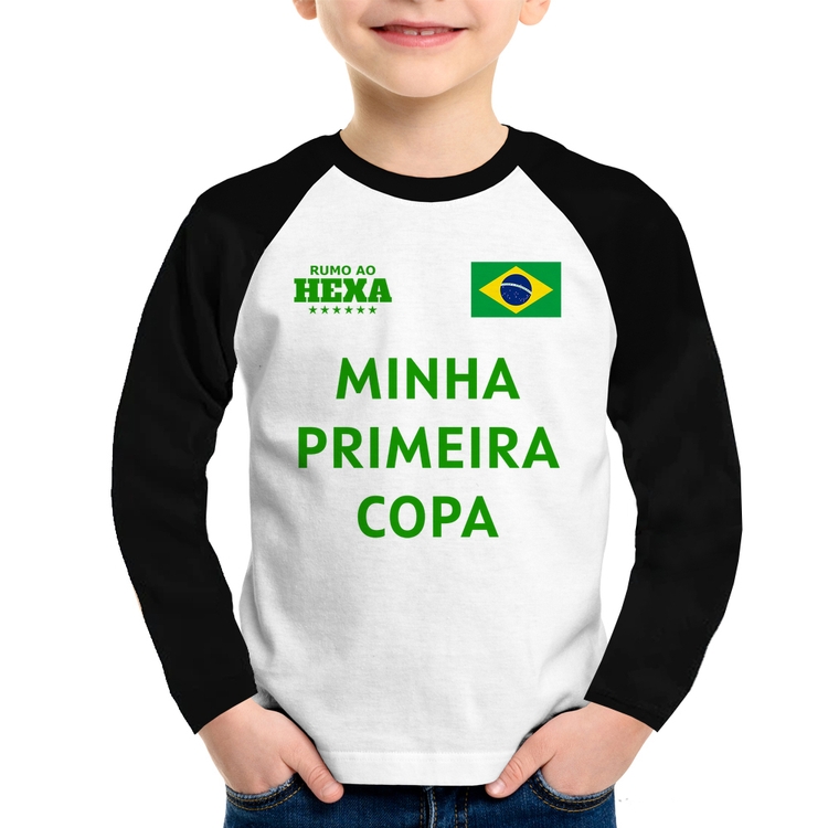 A Camiseta Raglan Infantil Minha Primeira Copa do Mundo Manga Longa é confeccionada em tecido 100% Poliéster com gola redonda na cor preta, costura simples e modelagem com caimento reto. A estampa do tema "Esportes" é feita através do processo Sublimação. Produto ideal para quem busca fidelidade da estampa e ótimo custo-benefício, a estampa não desbota nem quebra.
